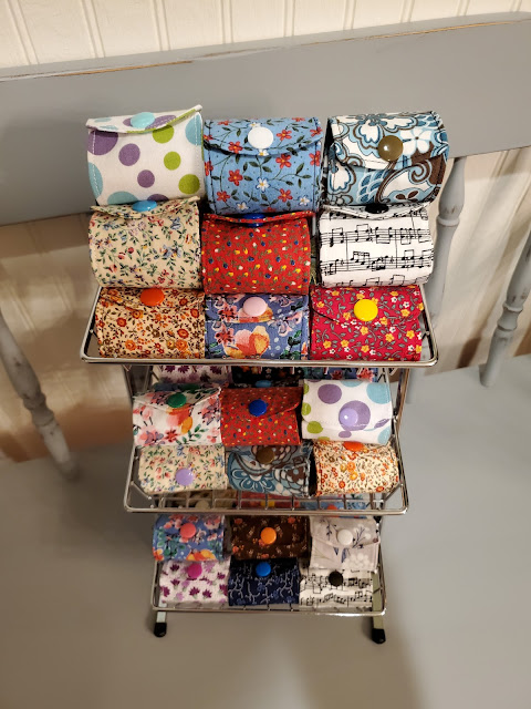 Anyone else shop at Aldi? Tired of scrounging around looking for a quarter to get a cart? I've been using my Aldi quarter key chain/coin purse for years and finally got around to sewing up some for the show this year. It is so convenient and it always has a few quarters in it - in case you want to share, or to know you have a few quarters on hand at any time. See below for the options of material - each are lined with a coordinating pattern, have a sturdy snap to close with and have the key ring attached - all you need is the quarter! $3.50 each
